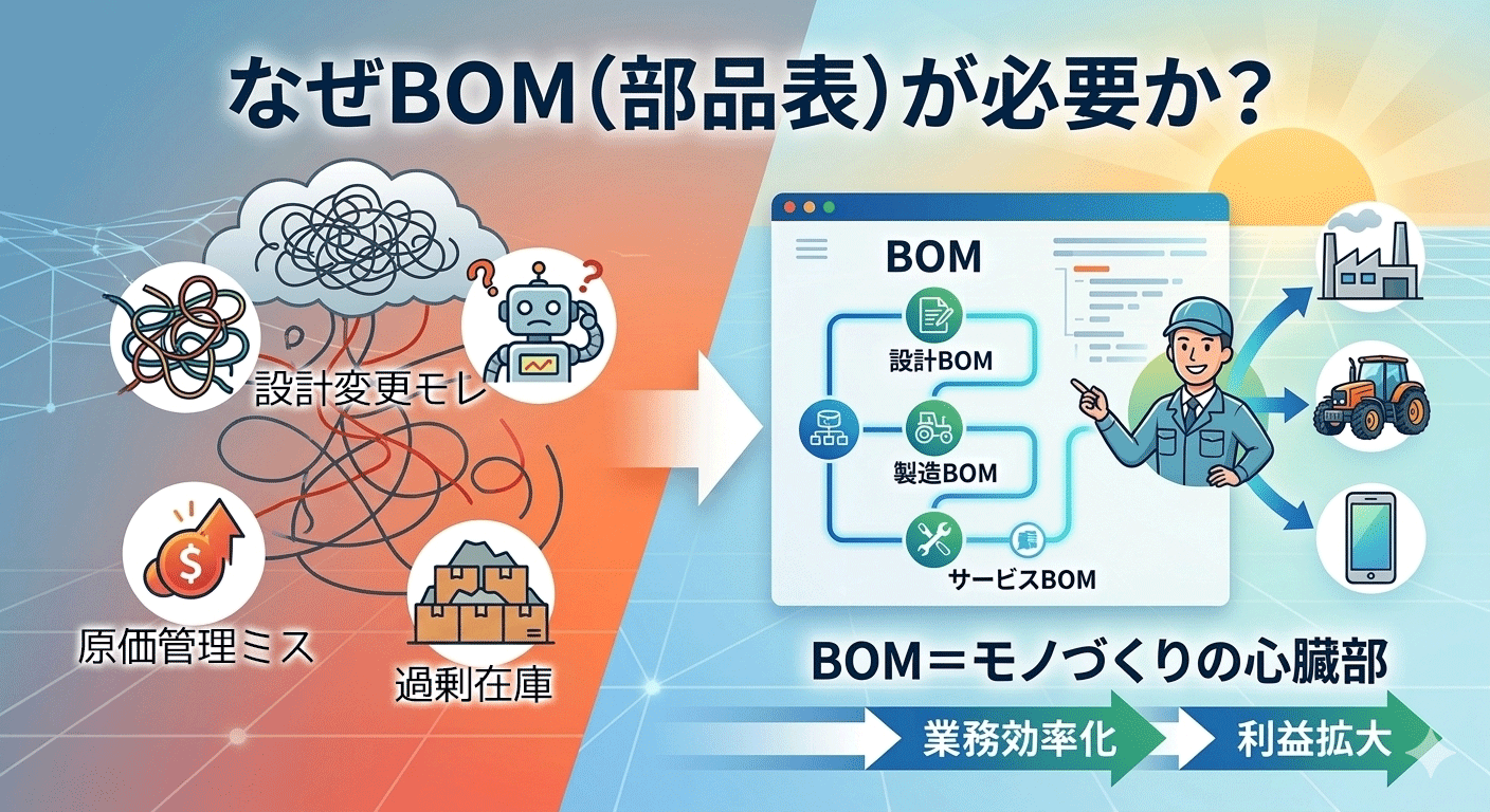 これらすべてのトラブルの根源を辿ると、たった一つの場所にたどり着きます。それがBOM(Bill of Materials:部品表)の管理です。