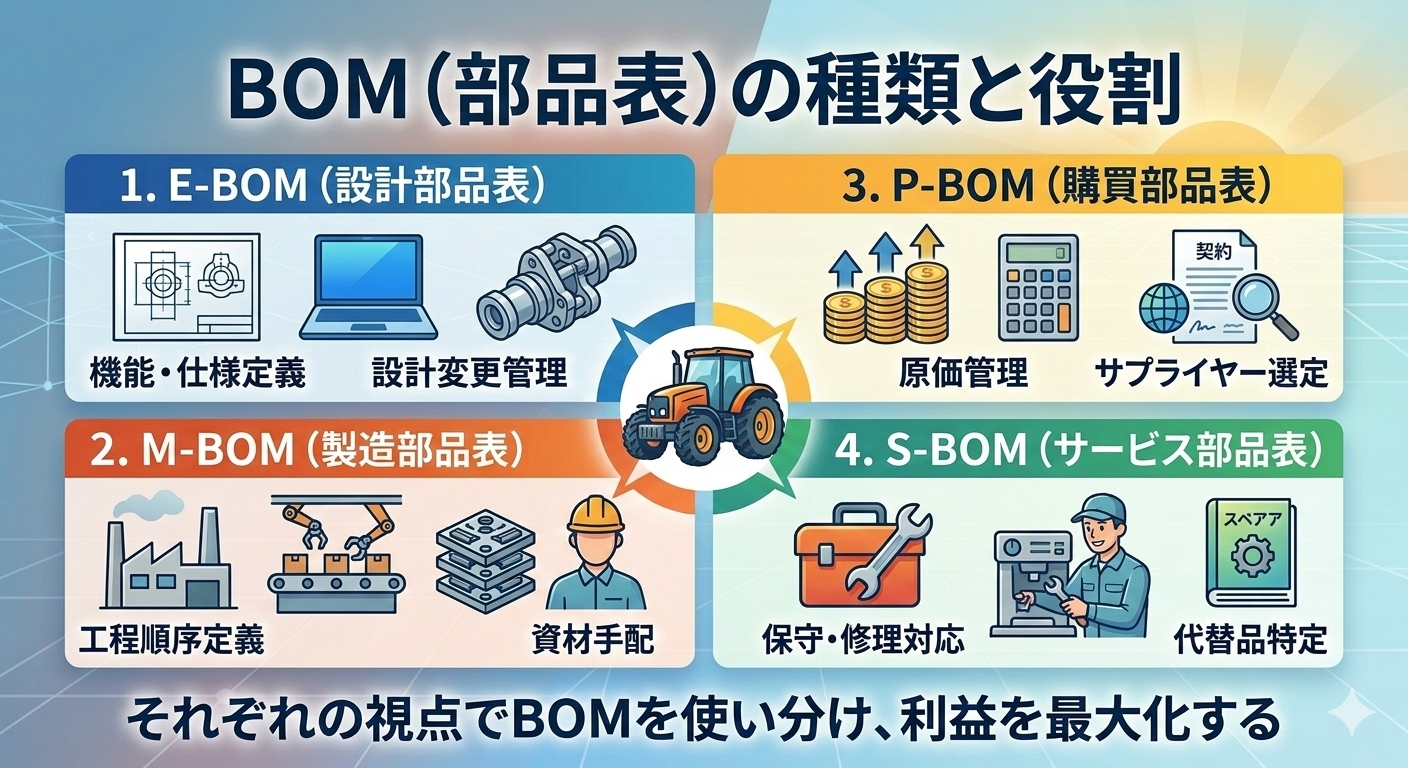 なぜ、一つの製品を作るのに、複数のBOMが必要なのでしょうか? それは、「立場が変われば、見たい情報が全く違うから」です。今回は、現場でも欠かせない、主要なBOMの種類とその目的を整理します。