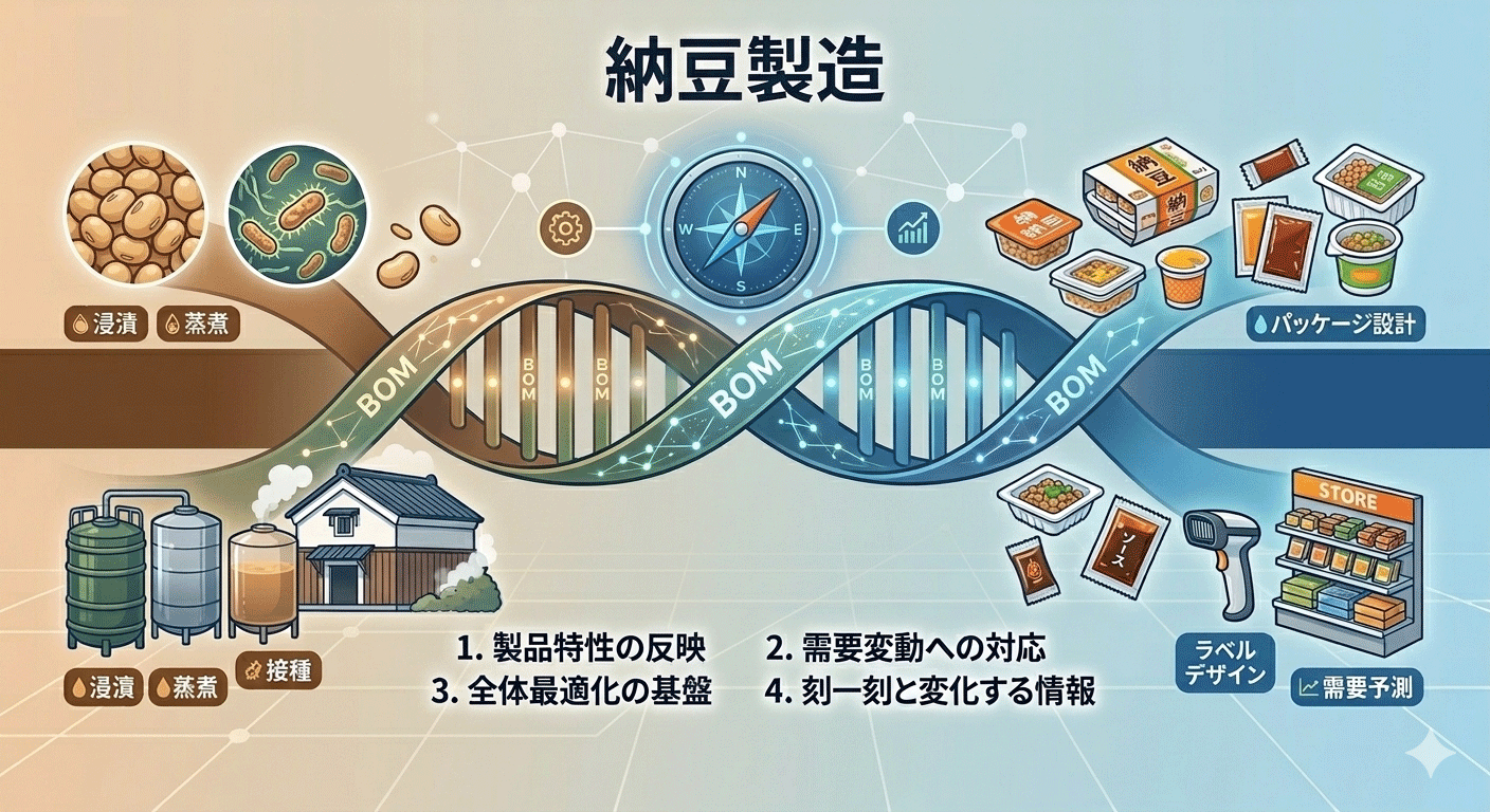 納豆メーカーの現場で起こるこうしたトラブルの裏側には、実は「BOM(部品表・配合表)」の機能不全が隠れています。納豆という製品は、一見シンプルに見えて、実は「生き物(バルク)」と「工業製品(パッケージ)」という、正反対の性格を持つものが同居する、非常に管理が難しい製品なのです。